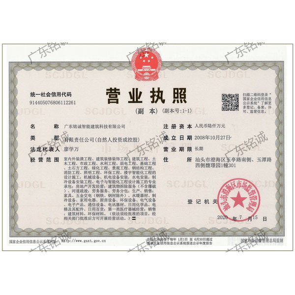 廣東銘誠智能建筑科技有限公司成立于2008年,公司注冊資金為6000萬元,集辦公裝修、酒店裝修、家庭裝修、軟裝裝飾、娛樂場所裝修為一體的裝飾公司,率先提出“創造現代人文空間,挑戰業界高峰”的雄壯口號,并以此為目標,完成了一大批具有影響力的大型公裝工程:其中包括廣州國際中醫藥展貿中心、奧飛澄海音樂廳、澄海區國家稅務局、澄海興信小額貸款、澄海潮商村鎮銀行、汕頭龍湖賓館、澄海豪庭大酒店、御園國際飲食城、澄海福晉軒酒家、享樂匯保健有限公司、假日商務酒店、尚景康園物業、星輝車模股份有限公司、奧飛動漫有限公司、香港國際玩具、汕頭萬基貿易有限公司、泰興源實業有限公司、汕頭皇冠玩具有限公司等;家裝工程包括南澳黃金海岸整幢的精裝房、中信華府、富春華庭、金信鳳凰名城、凱旋花園、中信金城、柏嘉半島、陽光海岸、金葉島等高等住宅。 ? 廣東銘誠智能建筑科技有限公司經過十余年的建筑裝飾裝修施工領域項目積淀,于2018年2月取得“建筑裝修裝飾工程專業承包二級”、“建筑機電安裝工程專業承包三級”、“建筑工程施工總承包三級”、“施工勞務不分等級”、“安全生產許可證”等專業資質,并于2021年8月建筑裝修資質正式升級為“建筑裝修裝飾工程專業承包一級”。這是對企業規模、工程業績、管理水平、誠信表現的肯定,是企業實力與能力的展現。 ? 公司每一項工程都始終堅持“精美設計、精心施工、確保合同承諾;勤奮開拓、追求突出、創造時代精品”的質量方針,力爭做一項工程,樹一座豐碑。 ? ?銘誠擁有一支由專業的營銷精英和客戶顧問組成的營銷隊伍,勤奮、敬業的每一位銘誠員工將本著“贏在別人休息時”的專業精神,為客戶提供全程營銷及售后服務,確??蛻舻暮戏ɡ?,提供體貼周到的服務,做到讓顧客滿意。 ? 銘誠擁有一批資老牌室內環境設計師,以“現代人文空間”為設計理念,為客戶提供人性化、差異化、智能化的室內環境設計服務,準確的將人性化特點與室內環境相融合,達到了“現代人文空間”的和諧統一。 ? ? ? ?自主創新、視社會責任為己任的精神使我們在發展的道路上屢獲殊榮:不斷提升的銘誠品牌知名度和美譽度,靠的是優質的產品,靠的是不斷提升的營業績,靠的是國內的核心技術和誠信的服務。相信通過銘誠人的努力,銘誠將會不斷以新的姿態為提升廣大消費者的生活質量做好服務,為中國裝飾行業設計創新做出突出貢獻。 ? ? “忘掉競爭、共